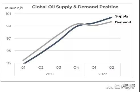 即使在當前的OPEC+限產的政策下,石油供應仍會繼續增加。在需求方面,消費總量已回到新冠肺炎之前的水平,因此未來需求的增長將會趨于平緩,預計到明年年中之前都將保持在略高于9,900萬桶/天的水平。