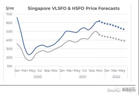 據分析師預測,目前的油價正在接近高點,未來會有一些下降的趨勢,回落到今年上半年的水平。新加坡極低硫燃料油的價格將在明年年中跌至500美元的低位,比現在每噸低100美元左右。到2022年年中,新加坡高硫燃料油價格將在380美元/噸左右。
