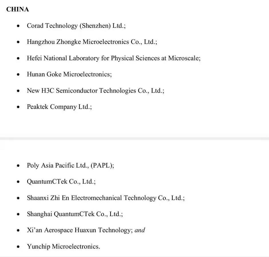 值得關注的是,創業板上市公司國科微(Hunan Goke Microelectronics)和科創板上市公司國盾量子(QuantumCTek Co., Ltd.)及子公司上海國盾量子(Shanghai QuantumCTek Co., Ltd)也在名單當中。